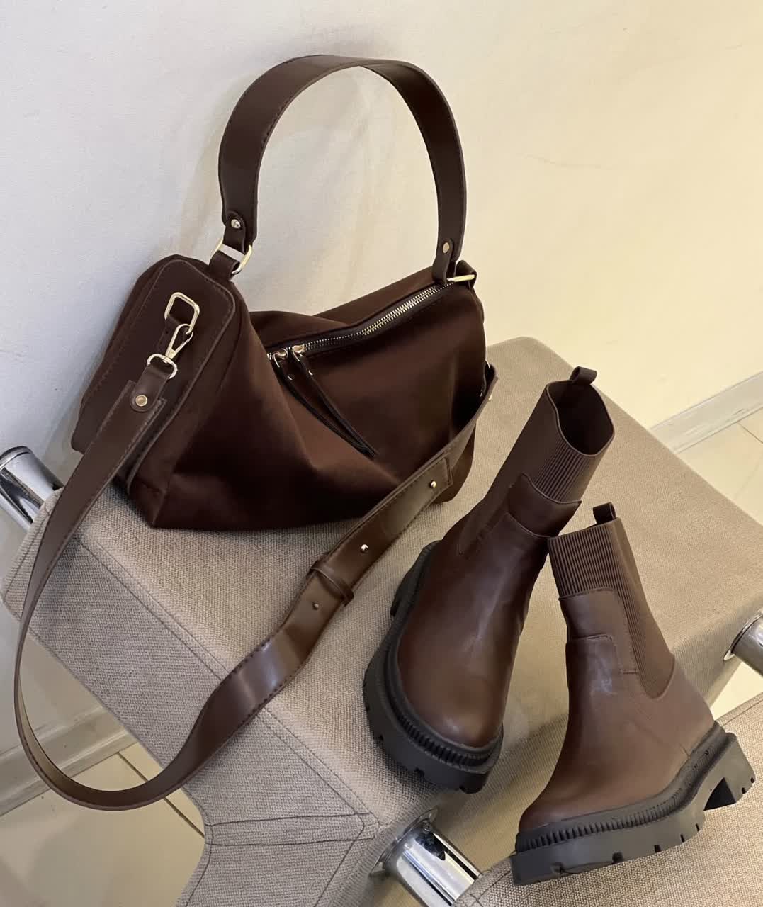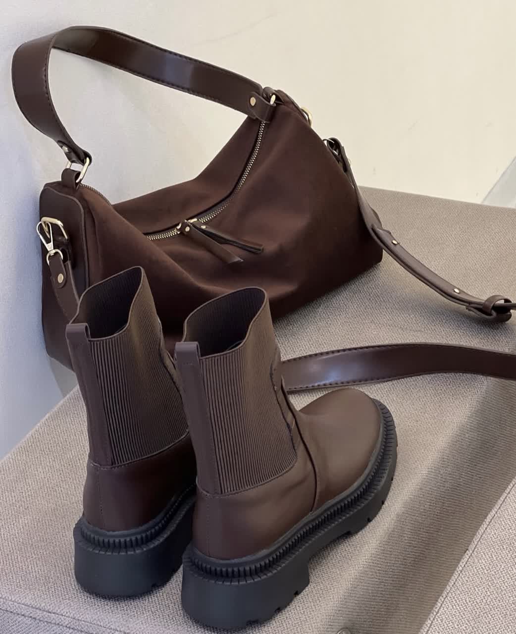 بوت جورابی زنانه بغل کش چرم قهوه ای طرح منگو