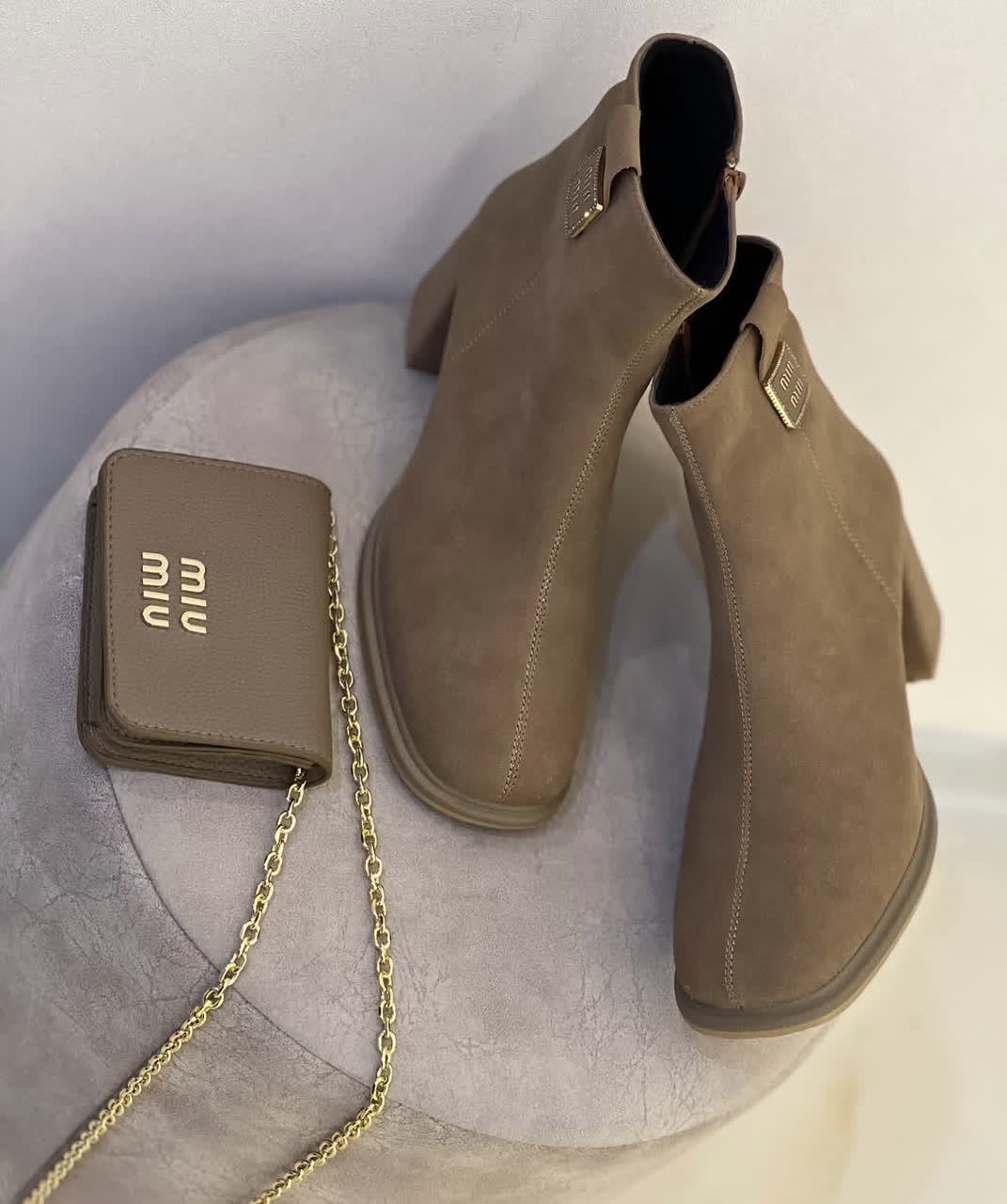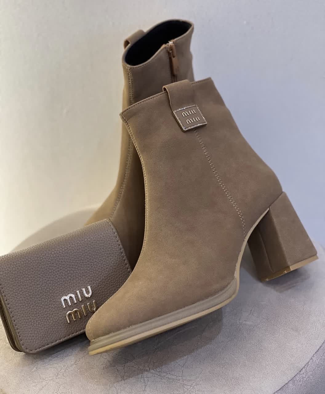 بوت پاشنه دار زنانه جیر نسکافه ای طرح میو میو پاشنه 7 سانت