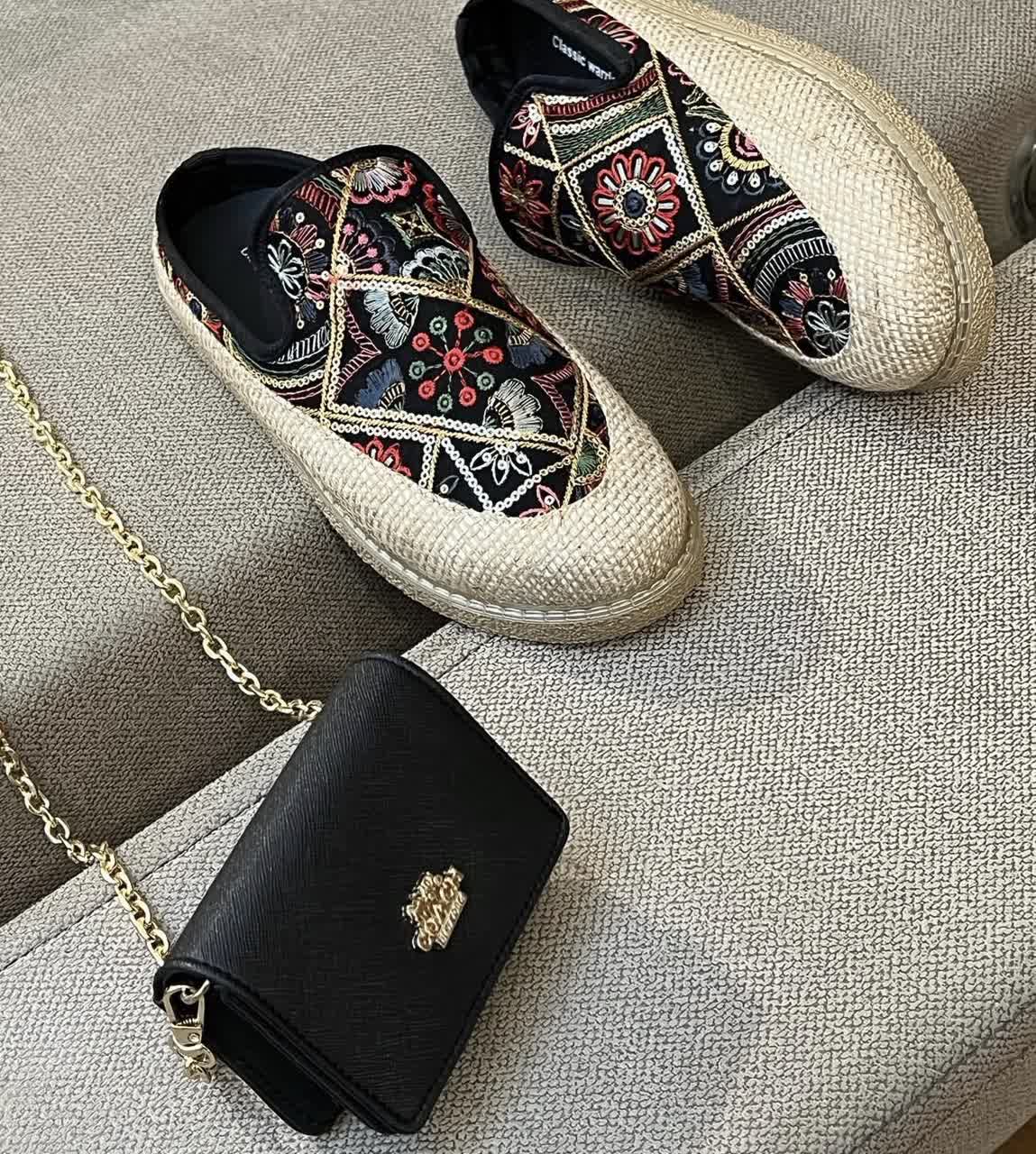 صندل زنانه مدل اسلیپر سنتی کنفی مشکی پولک طلایی