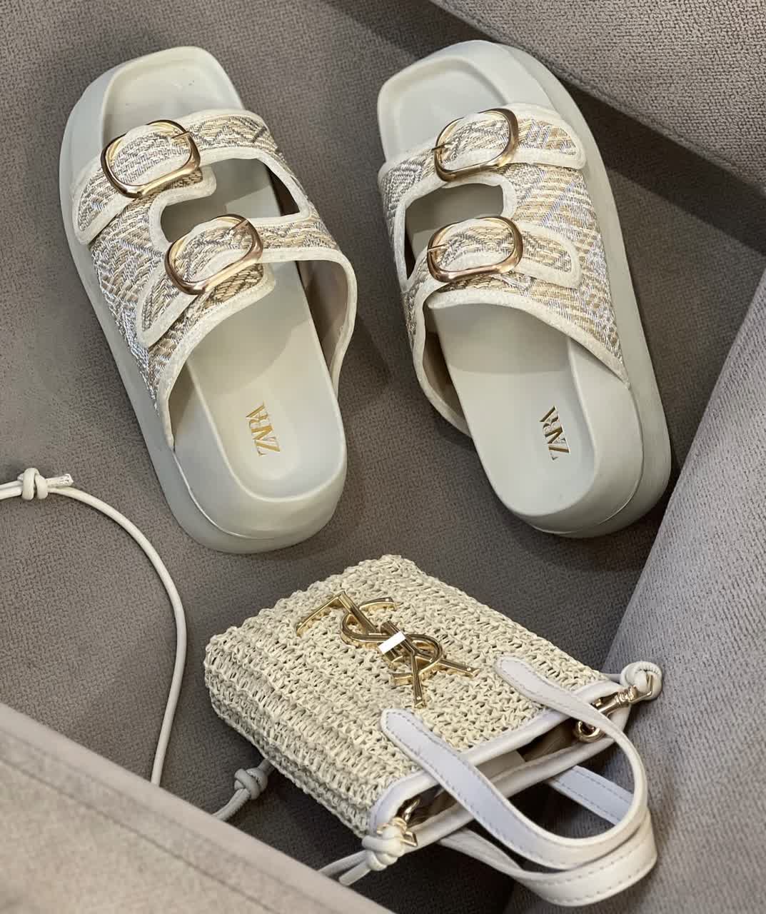 صندل زنانه کنفی طلایی لمه دار لژ 5 سانت سگک طلایی طرح زارا