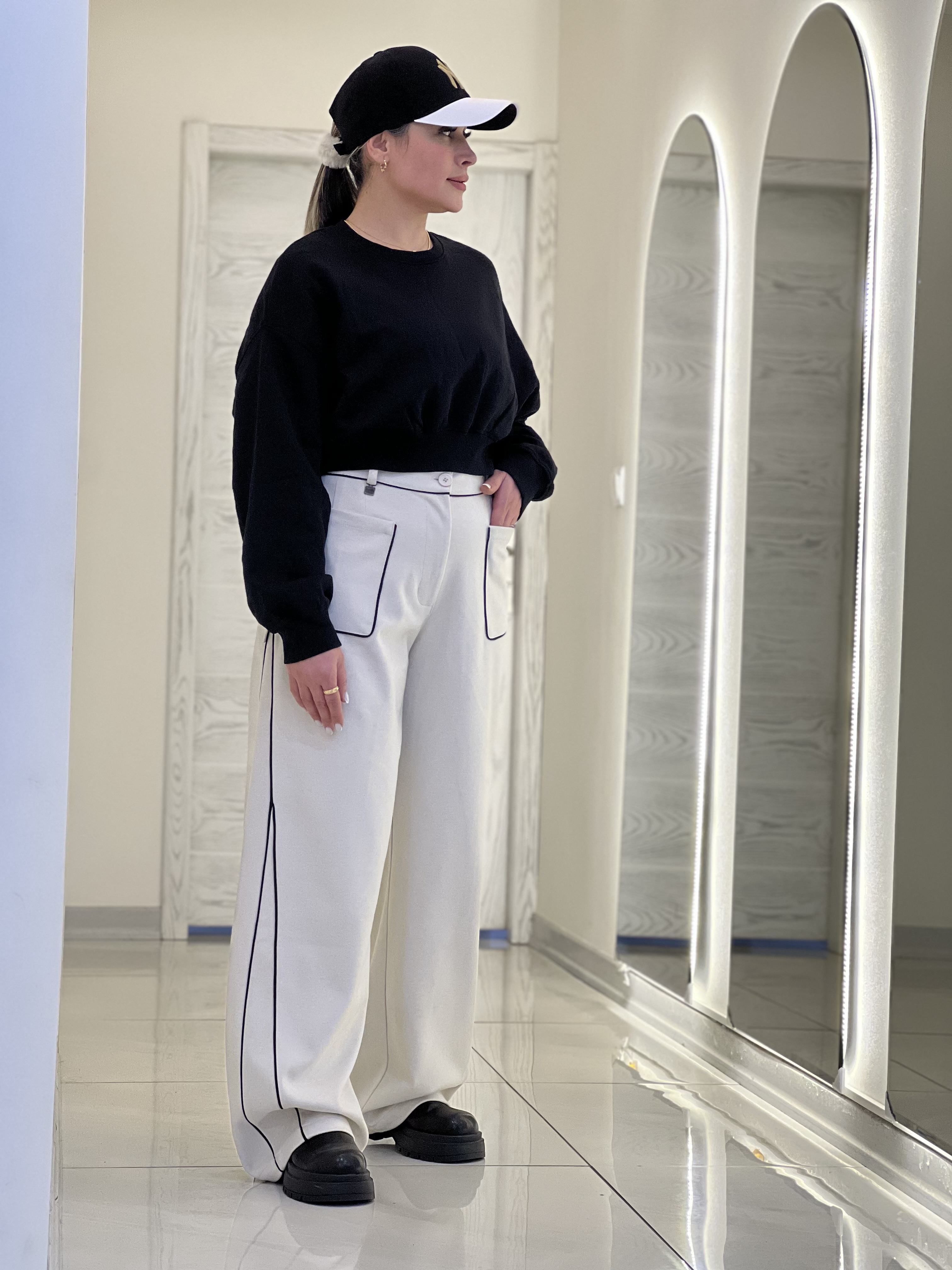 شلوار زنانه مدل بگ فوتر لامر کرم استخونی مغزی دوزی مشکی قد ١١٠