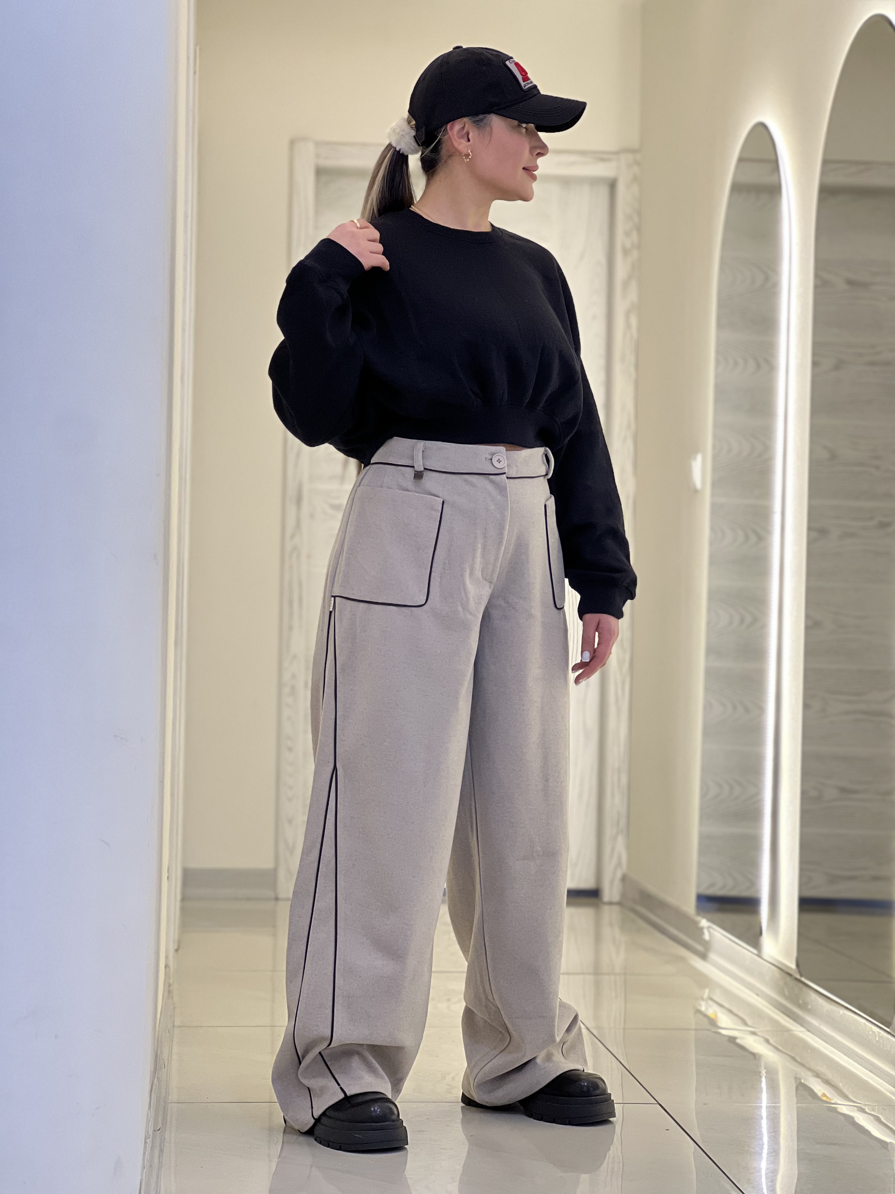 شلوار زنانه مدل بگ فوتر لامر نسکافه ای مغزی دوزی مشکی قد ١١٠
