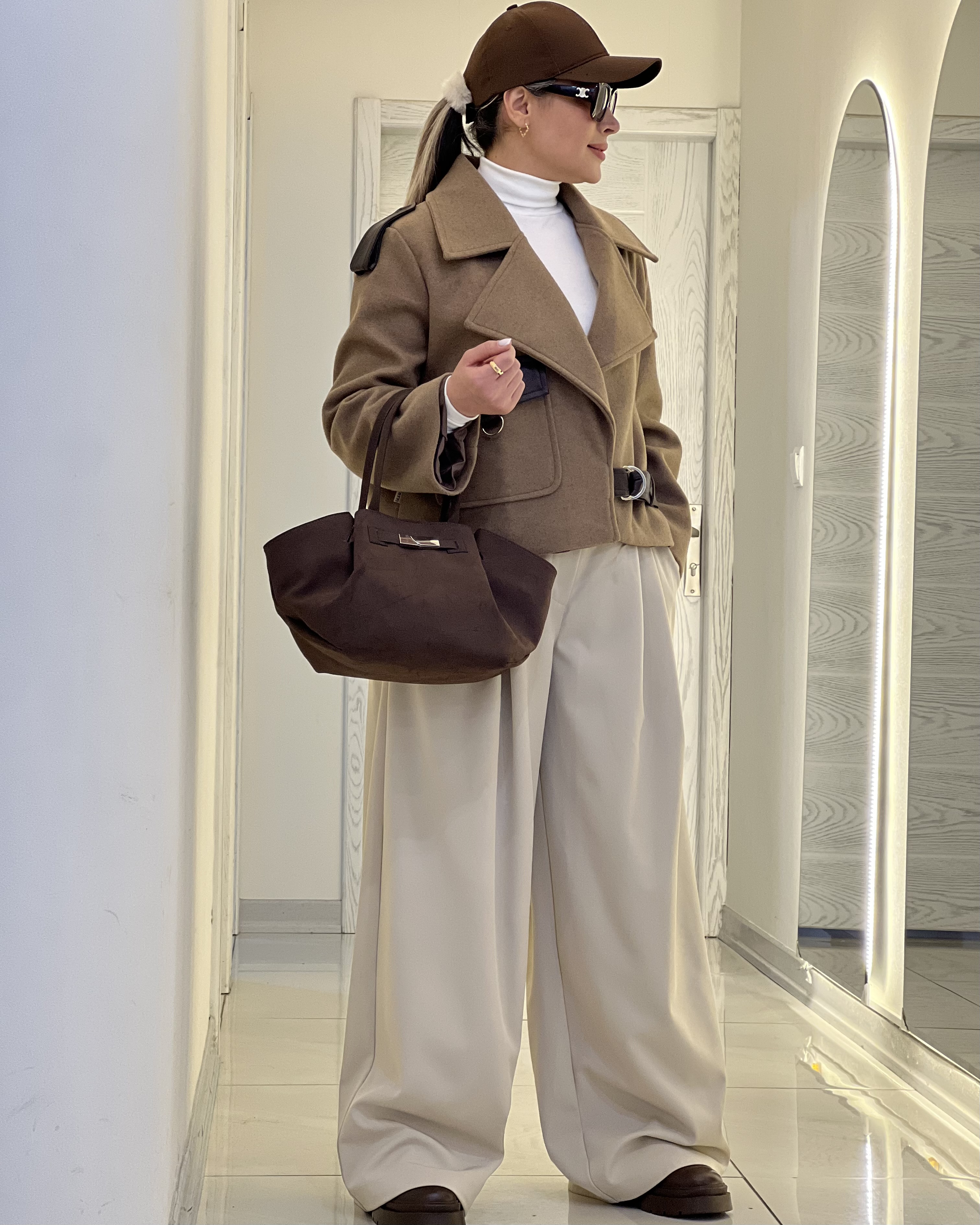 کت زنانه فوتر نسکافه ای آستردار مدل ترنچ کت با ترکیب چرم قهوه ای