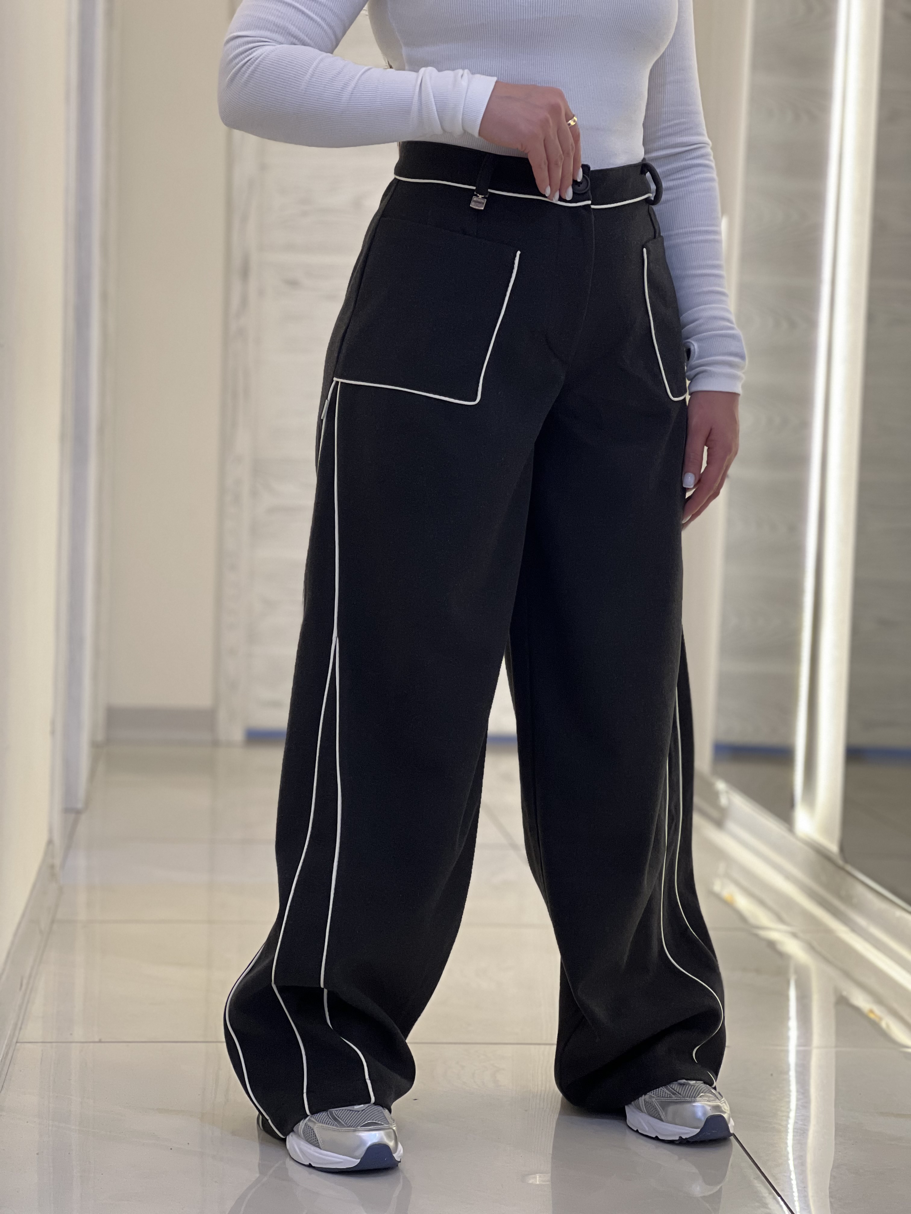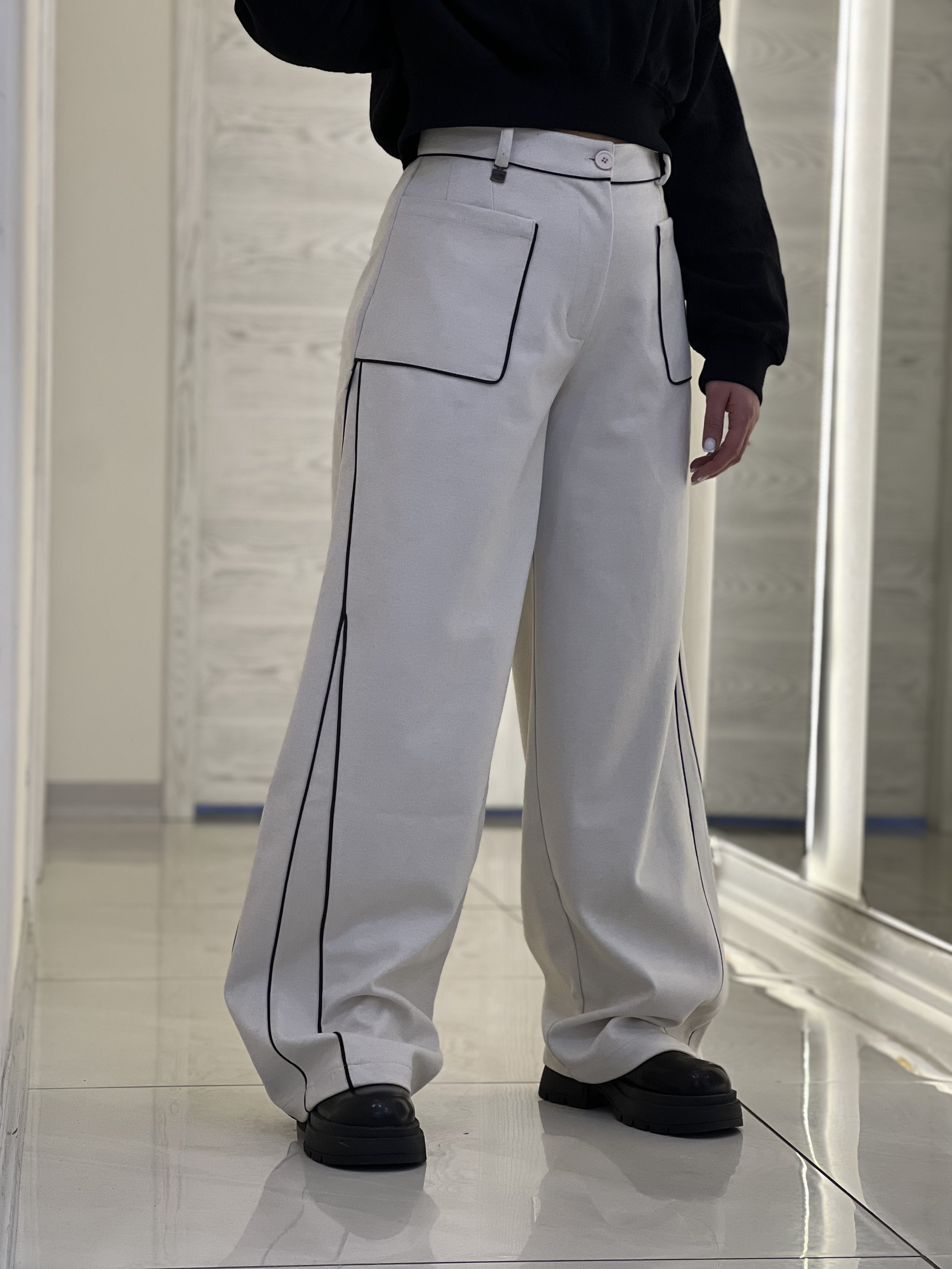 شلوار زنانه مدل بگ فوتر لامر کرم استخونی مغزی دوزی مشکی قد ١١٠