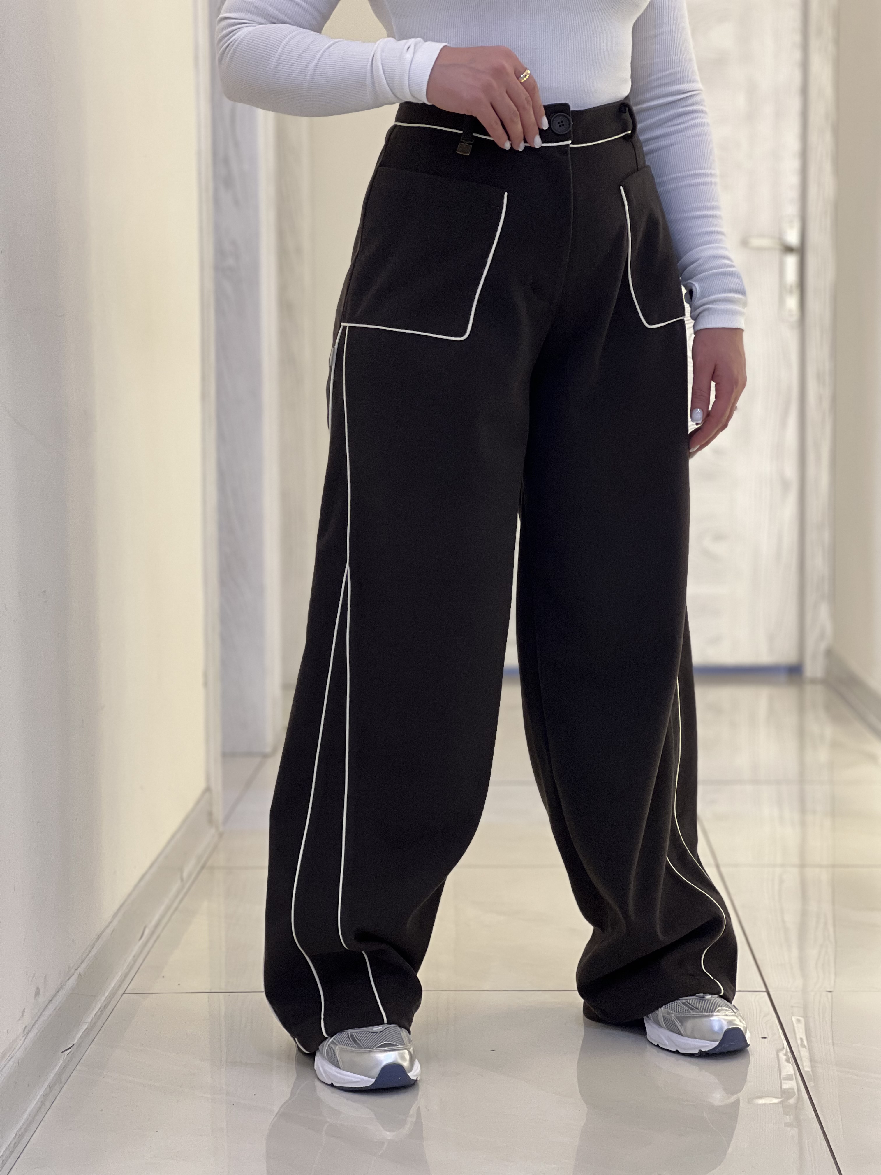 شلوار زنانه مدل بگ فوتر لامر نسکافه ای مغزی دوزی مشکی قد ١١٠